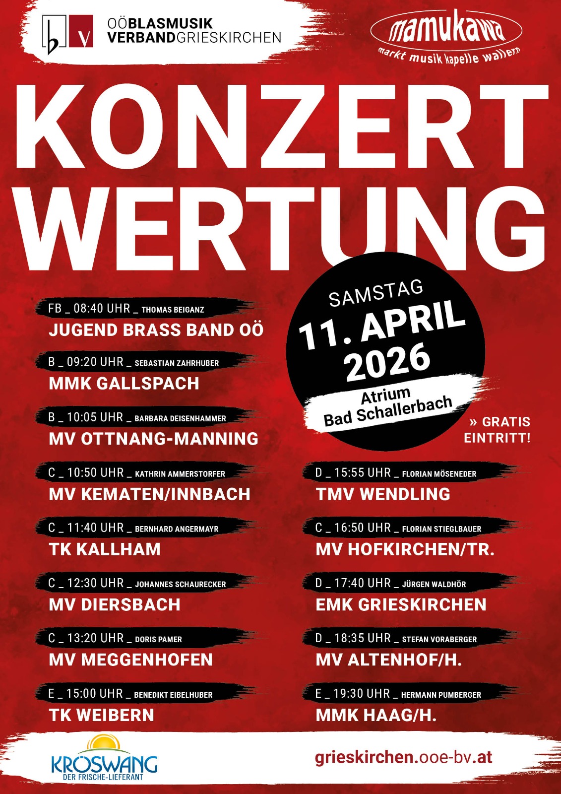Im Rahmen des Bezirksmusikfest- Jahres veranstalten wir gemeinsam mit dem oberösterreichischen Blasmusikverband Grieskirchen am 11. April 2026 die Konzertwertung des Bezirkes Grieskirchen.
